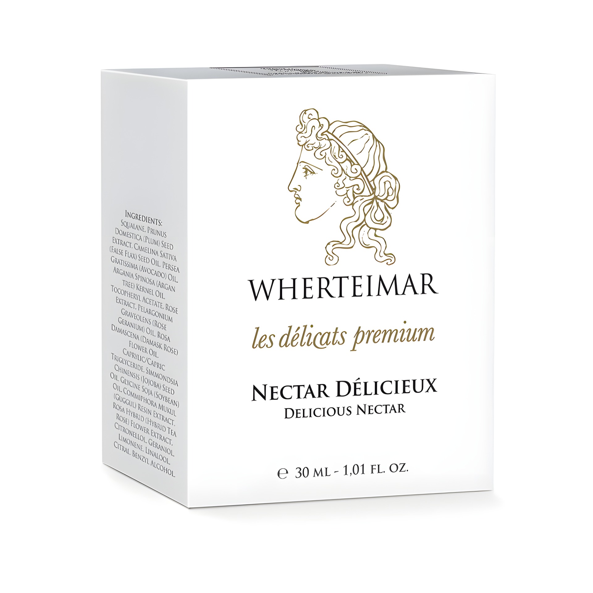 Squalane, Prunus Domestica (Plum) Seed Extract, Camelina Sativa (False Flax) Seed Oil, Persea Gratissima (Avocado) Oil, Argania Spinosa (Argantree) Kernel Oil, Tocopheryl Acetate, Rose Extract, Pelargonium Graveolens (Rose Geranium) Oil, Rosa Damascena (Damask Rose) Flower Oil, Caprylic/Capric Triglyceride, Simmondsia Chinensis (Jojoba) Seed Oil, Glycine Soja (Soybean) Oil, Commiphora Mukul (Guggul) Resin Extract, Rosa Hybrid (Hybrid Tea Rose) Flower Extract, Citronellol, Geraniol, Limonene, Linalool, Citral, Benzyl Alcohol.